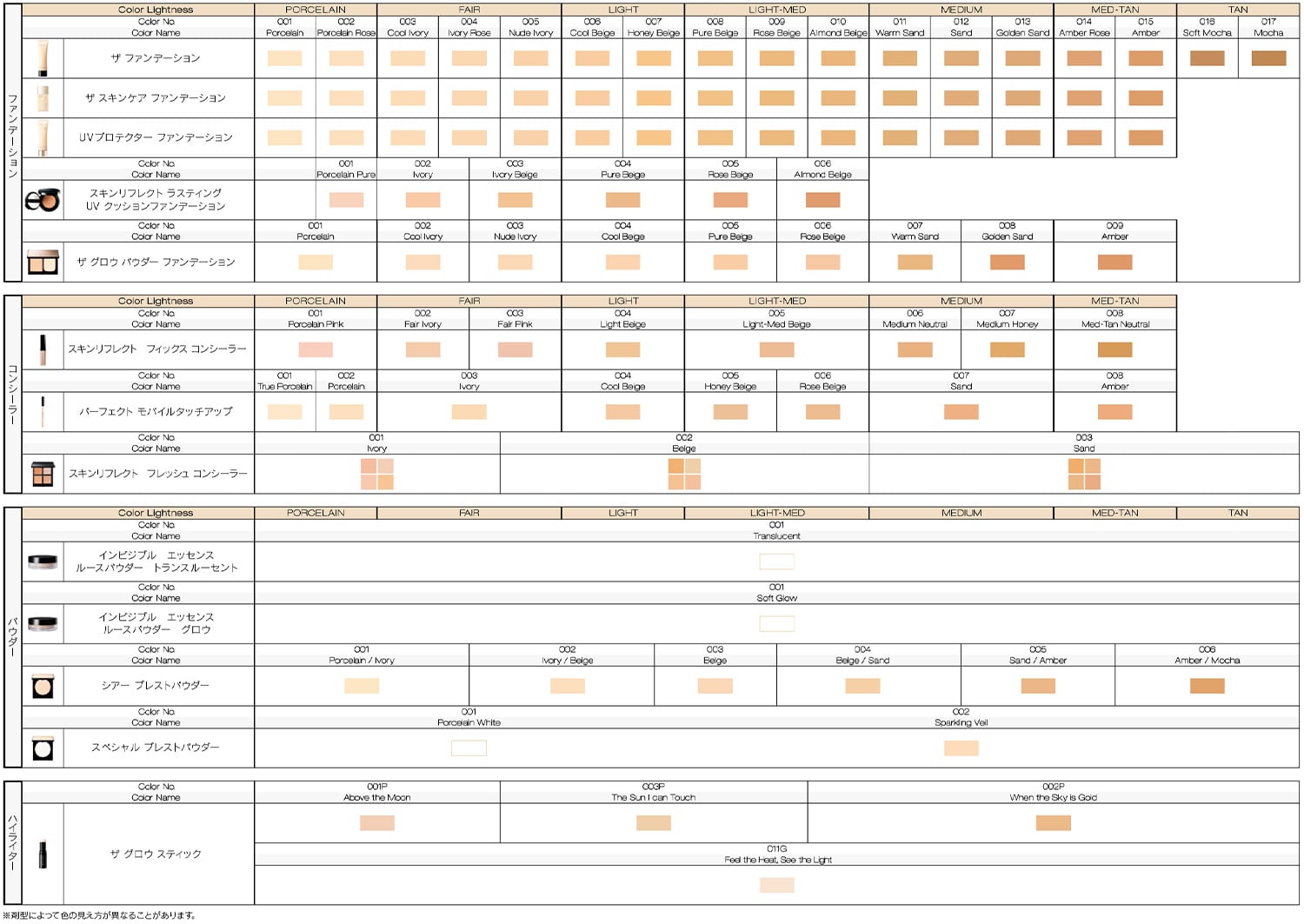 PORCELAIN / IVORY / BEIGE /SAND / AMBER / MOCHA の6つのカラーカテゴリー。