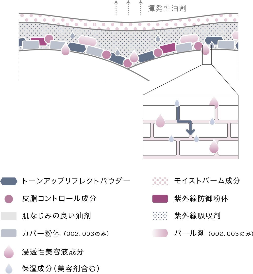 日焼け止めのお直しとしてメイクアップの上からも使えるように、下のベースメイクアップがヨレにくい工夫を。揮発速度の速い油剤を多く配合することで、瞬時にみずみずしく伸び広がり、下の膜をよれさせることなく、薄く均一な膜をつくることを可能にしました。